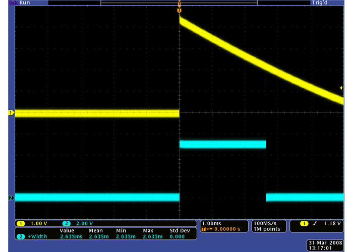 QTR-1RC output (yellow) when 1/8" above a black line and microcontroller timing of that output (blue).