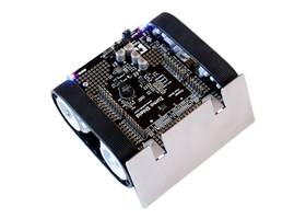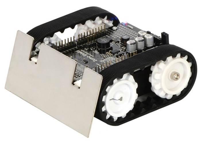 The Zumo robot for Arduino is an Arduino-controllable tracked robot platform that is less than 10 cm × 10 cm—small enough to qualify for Mini Sumo. It includes two micro metal gearmotors coupled to a pair of silicone tracks, a stainless steel bulldozer-style blade, an array of six infrared reflectance sensors for line following or edge detection, a buzzer for simple sounds and music, and a 3-axis accelerometer, magnetometer, and gyro for detecting impacts and tracking orientation. Just add 4 AA batteries and an Arduino (or compatible controller) and you are ready to push! No soldering or assembly is required.