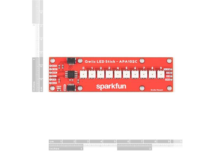 The SparkFun Qwiic LED Stick features ten addressable APA102 LEDs, making it easy to add full-colour LED control using I2C.