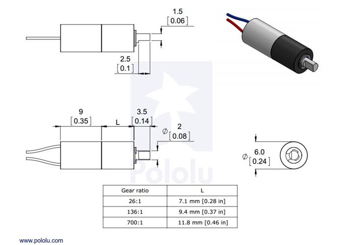 The following diagram shows the micro plastic gearmotor dimensions in mm. The planetary gearbox has a D-shaped plastic output shaft, which is 2 mm in diameter with a section that is flattened by 0.5 mm. The “D” portion of the shaft is 2.5 mm long. The motor measures 6 mm in diameter and 9.3 mm in length, and the gearbox length, labelled “L” in the diagram below, depends on the gear ratio.