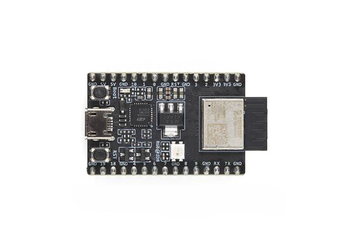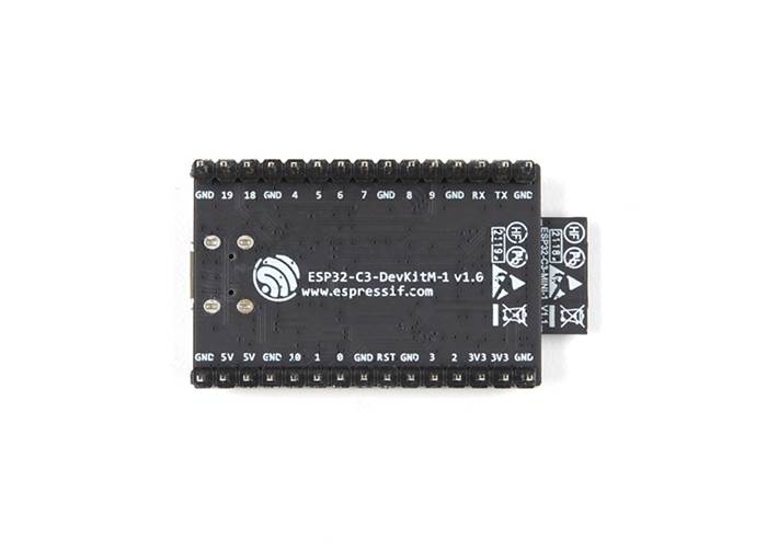 Most of the I/O pins on the ESP32-C3-MINI-1 module are broken out to the pin headers on both sides of this board for easy interfacing. Developers can either connect peripherals with jumper wires or mount ESP32-C3-DevKitM-1 on a breadboard.