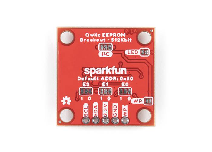 Note: The I2C address of the EEPROM - 512Kbit is 0x50 and is jumper selectable to 0x51, 0x52, 0x53, 0x54, 0x55, 0x56, or 0x57. A multiplexer/Mux is required to communicate to multiple EEPROM - 512Kbit sensors on a single bus. If you need to use more than one EEPROM Breakout consider using the Qwiic Mux Breakout.