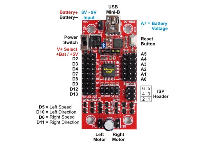 - Digital pins on servo compatible 3 pin headers with selectable voltage (+Battery or +5V).