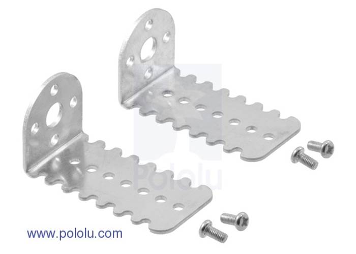 These aluminum gearmotor brackets let you securely mount Pololu’s 25D mm metal gearmotors to your project. The brackets are sold in pairs, and each bracket includes two M3 screws for securing the motor to the bracket. Each bracket also features seven mounting holes and twelve mounting slots for M3 or #4-size screws (not included), giving you a variety of mounting options.