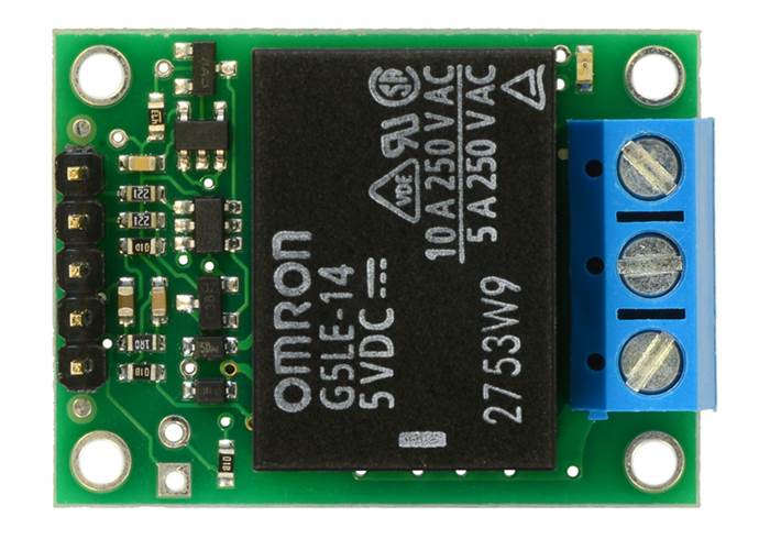 This RC relay enables easy control of large, electrically isolated loads in radio control (RC) systems. The activation threshold and direction are configurable, and a safe-start feature reduces the likelihood of unexpected activation. This assembled version ships with the 5V relay, terminal block, and straight male header pins soldered in, so it can be integrated into hobby RC systems without the need for additional soldering. The included power relay is an Omron G5LE-14-DC5 and is rated for up to 10 A under most conditions.