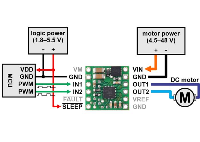 In a typical application, power connections are made on one side of the board and control connections are made on the other. Aside from motor and power connections (including a logic voltage connection to SLEEP), the only required control pins are IN1 and IN2.