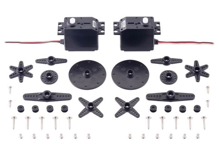 The servo has an 11″ (270 mm) lead that is terminated with a JR-style connector and includes additional servo horns and mounting hardware. The following picture shows an example of the hardware that might be included (actual hardware could vary):