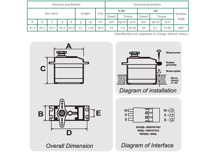 | FEETECH FS5106R | 95 | 83 | 78 | 70 | 39 | 40.8 × 20.1 × 38.0 | CW→CCW | $13.95 | ||