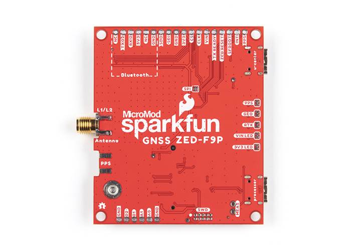 The number of configuration options of the ZED-F9P is incredible! Geofencing, variable I2C address, variable update rates, even the high precision RTK solution can be increased to 20Hz. The MicroMod GNSS carrier board even has five communications ports, four of which are all active simultaneously: USB-C (which enumerates as a COM port), UART1 (with 3.3V TTL), UART2 for RTCM reception (with 3.3V TTL), I2C (via the one Qwiic connector or broken out pins), and SPI. As previously mentioned, because of the MicroMod M.2 connector, the ZED-F9P's UART1, UART2, SPI, and I2C ports are available without soldering! Other SparkFun ZED-F9P offerings have this capability, but only after you solder hookup wires appropriately.
