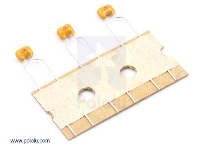 These 0.1 μF 100 V ceramic capacitors have many uses, including noise suppression on motors. The leads are formed with 0.2" spacing for easy breadboard use. You can see more information about noise suppression in Polou's motor driver application note.