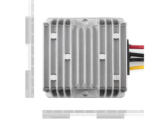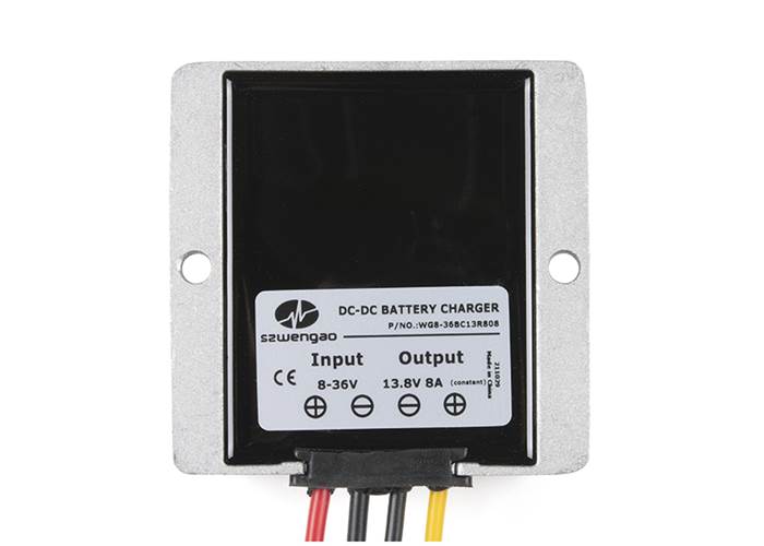 The charger accepts 8-36V DC inputs via 14 AWG wires (The Red and Black ones) and outputs 13.8VDC and a constant 8A for current via the 16AWG wires (Yellow and Black).