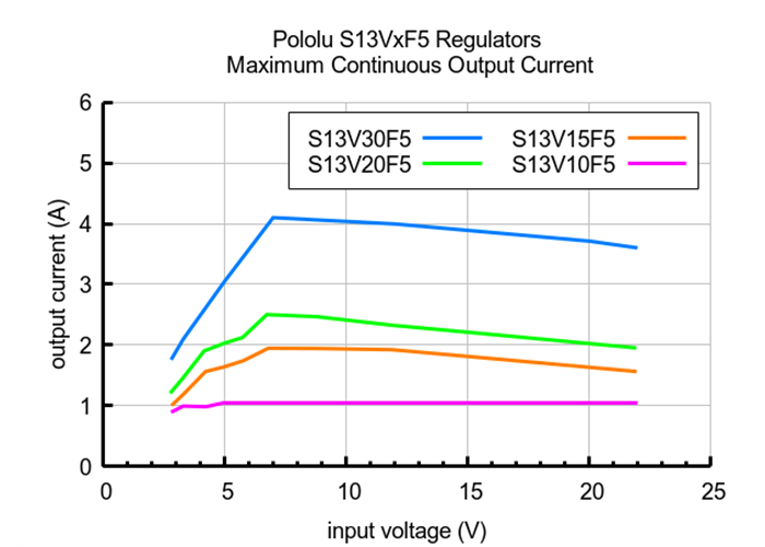 The maximum achievable output current of the regulator varies with the input voltage but also depends on other factors, including the ambient temperature, air flow, and heat sinking. The graph below shows maximum output currents that the regulators in the S13VxF5 family can deliver continuously at room temperature in still air and without additional heat sinking.