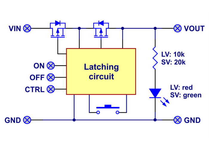 The switch and control inputs control the state of a latching circuit that in turn controls a pair of power MOSFETs through which the main current flows. Four versions of the Pololu Pushbutton Power Switches are available: