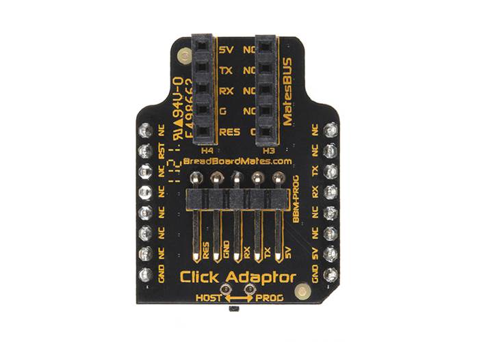 The Click Adaptor features a 5-pin programming header to program the connected device directly through the Click Adaptor, using the Mates Programmer. A selection switch allows switching between device programming mode or connection of the device to the Host, allowing the Click Adaptor connected to the Host board when the connected device (such as the TIMI-96) requires programming. The only interface to the MatesBUS is a 3.3V level Asynchronous Serial UART, used for communication between the Host and the connected device on the MatesBUS. Reset to the MatesBUS is also connected to the RST of the mikroBUS™.