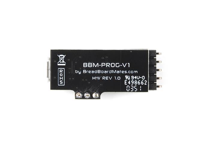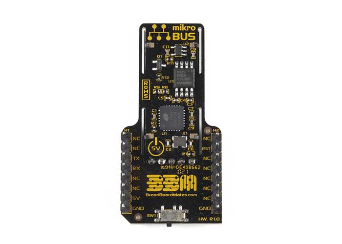 The TIMI Click also features a 5-pin programming header, to program its processor using the BreadBoard Mates Programmer, and a selection switch (on the back – accessible from the bottom edge) to switch between device programming mode or connection of the device to the mikroBUS™ Host.
