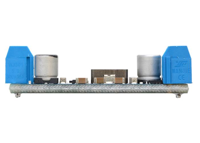 Pololu step-up voltage regulator U3V50x with included terminal blocks installed, side view. |