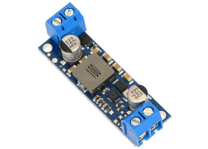 These boost (step-up) voltage regulators generate higher output voltages from input voltages as low as 2.9 V. They are switching regulators (also called switched-mode power supplies (SMPS) or DC-to-DC converters) and have a typical efficiency between 80% to 95%. The available output current is a function of the input voltage, output voltage, and efficiency (see the Typical Efficiency and Output Current section below), but the input current can typically be as high as 5 A. This regulator is available with a fixed 5 V, 6 V, 9 V, 12 V, or 24 V output: