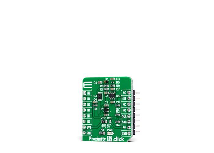Proximity 17 Click as its foundation uses the TMD2635, a miniature close-range proximity sensor module from ams AG. The TMD2635 implements a 940nm infrared VCSEL (Vertical Cavity Surface Emitting Laser) factory calibrated for IR proximity response, alongside a digital I2C serial interface. The proximity detection feature provides object detection (e.g., close proximity) by photodiode detection of reflected IR energy sourced by the integrated VCSEL emitter. The proximity engine also features a wide range offset adjustment to compensate for unwanted IR energy reflection at the sensor. The results are further improved by automatic ambient light subtraction.