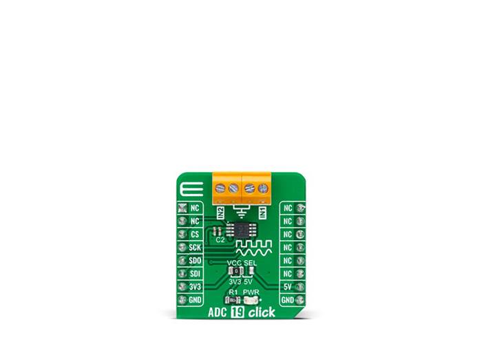 ADC 19 Click is a compact add-on board that contains a high-performance data converter. This board features the ADC122S101, a low-power two-channel CMOS 12-bit analogue-to-digital converter from Texas Instruments.