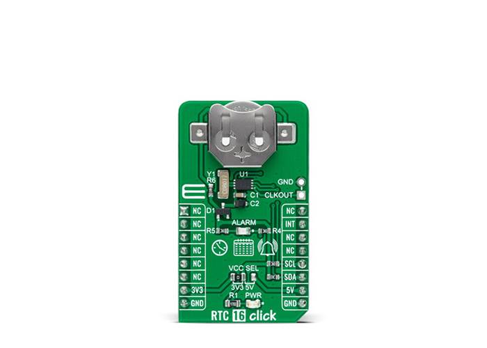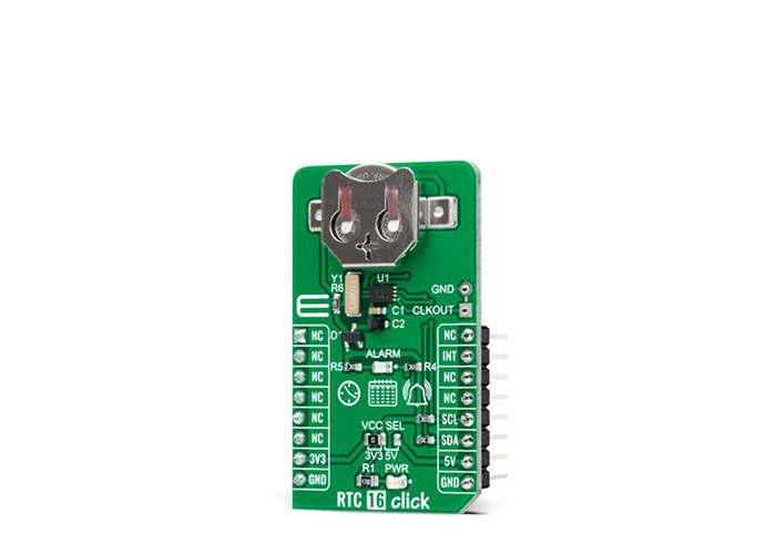 This Click board™ communicates with MCU using the standard I2C 2-Wire interface to read data and configure settings, supporting a Fast Mode operation up to 400kHz. An alarm and interrupt function is also available that outputs an interrupt signal to the INT pin of the mikroBUS™ socket when the day of the week, hour, or minute matches with the preset time. An alarm may be selectable between ON and OFF for each day of the week, allowing outputting warning every day or on a specific day indicated by a red LED marked as ALARM. Besides, the RTC 16 Click also has an onboard header labelled CLKOUT, which provides clock pulses of 32kHz.
