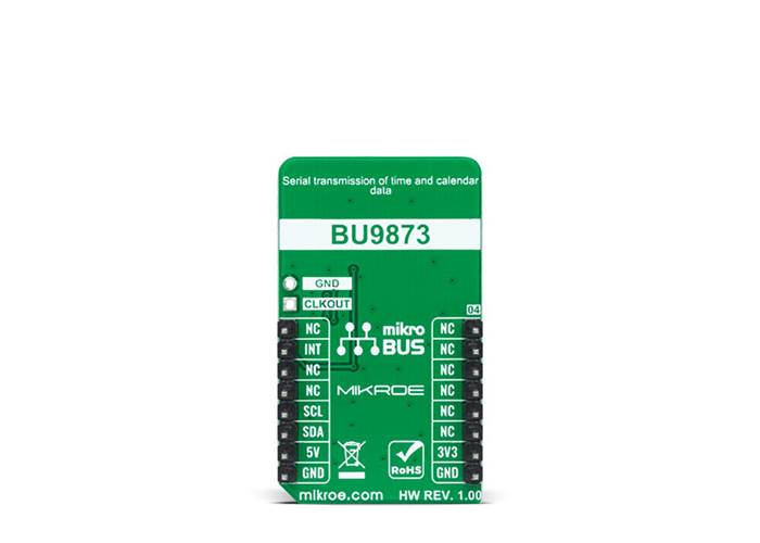 RTC 16 Click is a compact add-on board that accurately keeps the time of a day. This board features the BU9873, a CMOS real-time clock that has a built-in interrupt generation function from Rohm Semiconductors. The BU9873 provides year, month, day, weekday, hours, minutes, and seconds based on a 32.768kHz quartz crystal. This RTC is connected to the MCU through an I2C interface and configured to serial transmit time and calendar data. It also has an alarm function that outputs an interrupt signal to the MCU when the day of the week, hour, or minute matches with the preset time. This Click board™ is suitable for various time-keeping applications, including daily alarms, metering applications, and others requiring an accurate RTC for their operation.
