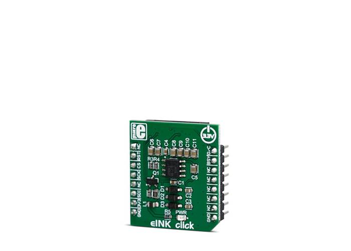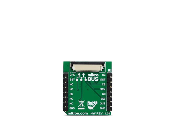 eINK Click is an adaptor Click board™, used to interface a compatible eINK display with the host MCU. The most distinctive feature of the eINK displays is their very low power consumption and the ability to retain the information, even after disconnecting from the power source.