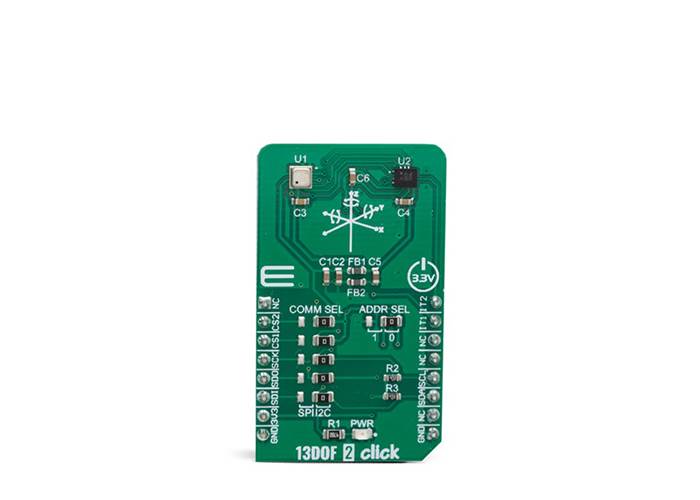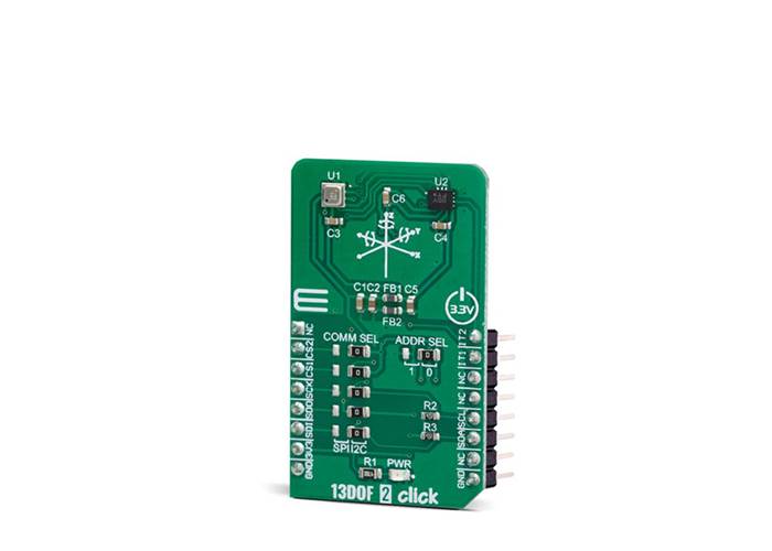 13DOF 2 Click is an advanced 13-axis motion tracking Click board™, which utilizes two different sensor ICs onboard: BME680, Volatile Organic Compounds (VOCs), humidity, pressure and temperature sensor and BMX160, a 9-axis sensor consisting of a 3-axis, low-g accelerometer, a low power 3-axis gyroscope and a 3-axis geomagnetic sensor. Both integrated sensor ICs are made by Bosch Sensortec, featuring the state-of-the-art sensor technology processes, in order to fulfill the requirements for immersive gaming and navigation applications, which require highly accurate sensor data fusion. Besides that, 13DOF 2 Click is also perfectly suited for use in many other applications such as mobile phones, tablet PCs, GPS systems, Smart watches, Sport and fitness devices, and many more.