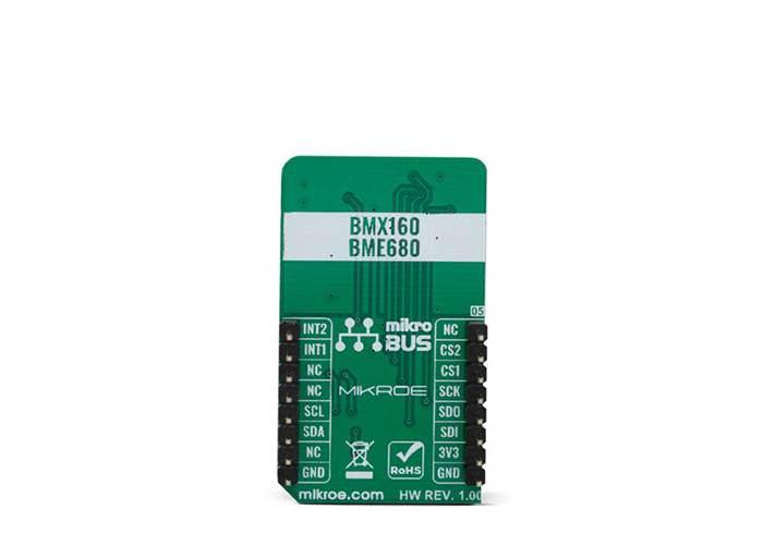 The BME680 is a digital 4-in-1 sensor with VOC, humidity, pressure and temperature measurement based on proven sensing principles, housed in an extremely compact metal-lid LGA package. Its small dimensions and its low power consumption enable the integration in battery-powered or frequency-coupled devices, such as handsets or wearables. The BMX160 is a highly integrated, low power 9-axis sensor that provides precise acceleration and angular rate (gyroscopic) and geomagnetic measurement in each spatial direction. It integrates the 16-bit digital, triaxial accelerometer, 16-bit digital, triaxial gyroscope, and a geomagnetic sensor. 13DOF 2 Click has these two ICs integrated onboard, which makes it a very powerful motion and sensing applications designing tool.