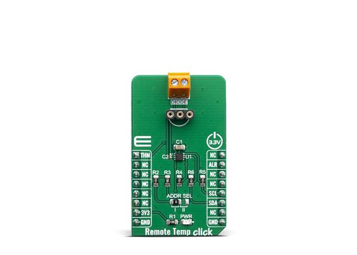 There are some specific requirements for a discrete component when using it as a remote temperature sensor: for example, it has to be a small signal BJT. For more information, please refer to datasheet of the EMC1833, which also states some forward voltage ranges for the highest and the lowest expected temperatures and other parameters which should be considered when selecting the transistor. The discrete component can be connected to the screw terminal at the edge of the Click board™.
