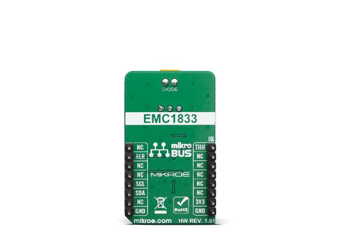 The EMC1833 features a high accuracy of ±1°C within the range between -40°C and +125°C, which is a critical thermal bandwidth of most IC with the substrate PNP or NPN transistor as a temperature sensor. However, the Click board™ can be operated within the range between -40°C to +125°C when used to measure the Internal/External temperature. Features such as dual temperature measurement, high accuracy, and programmable ALARM events, allow this Click board™ to be used in many applications, including dual-zone thermal monitoring in FPGA, embedded, and PC systems, i.e. when it is required to monitor both the ambient temperature within the enclosure, as well as the IC die temperature, for test and measurement applications, and similar.