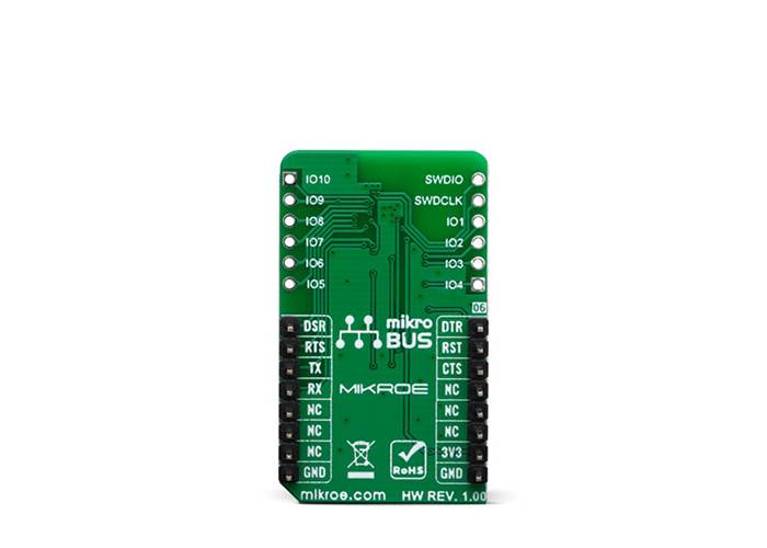 Besides the mikroBUS™ socket, BLE 8 Click also features two optional 6-pin header mounts, with marked pin labels. All of these pins can be externaly connected and used for various purposes. SWDCLK and SWDIO pins are reserved for the SWD interface, which the ANNA-B112 series modules uses for flashing and debugging. The rest of the external pins, labelled as IO1-IO10 are general purpose IO type and can be programmed according to the users needs.