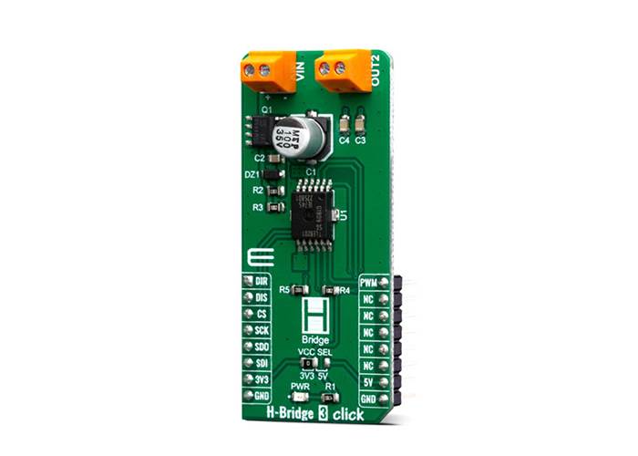 H-Bridge 3 Click is designed for the control of small DC motors and inductive loads, it features TLE9201SG a general purpose 6A H-Bridge perfectly suited for industrial and automotive applications. This IC meets the harsh automotive environmental conditions and it is qualified in accordance with the AEC-Q100 standard, also has set of features such as the short circuit and over-temperature protection, under-voltage protection, detailed SPI diagnosis or simple error flag and fully 3.3/5.5V compatible logic inputs.