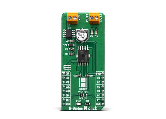 H-Bridge 3 Click is designed for the control of small DC motors and inductive loads, it features TLE9201SG a general purpose 6A H-Bridge perfectly suited for industrial and automotive applications.