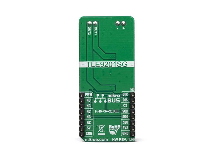 The main component used on the H-Bridge 3 Click is the TLE9201SG, an H-Bridge DC motor driver, with up to 28V and 6A, from Infineon. This IC is an efficient integrated H-bridge driver, with very low RDS ON output per switch. H-bridge in general, allows the current to flow in one or another direction.