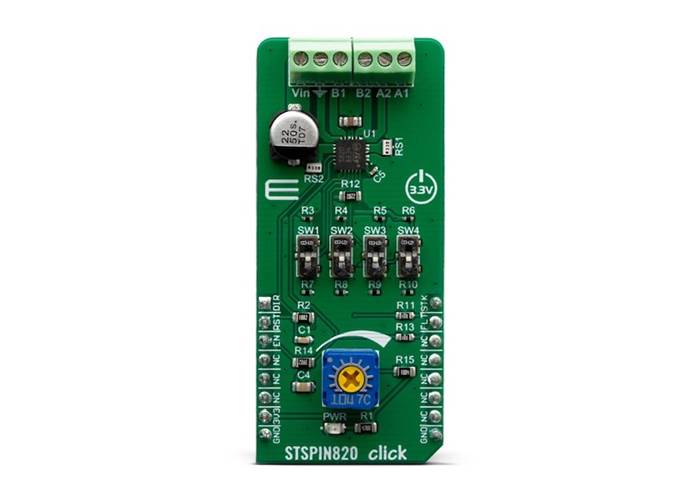 STSPIN820 Click is a stepper motor driver with the PWM current control, selectable microstepping up to 256 microsteps, and a wide voltage range. It is based on the STSPIN820, a stepper motor driver from STSPIN8 series. Designed to be a bullet-proof solution for the new wave of demanding industrial applications, it integrates two full-bridges with low ON resistance, the control logic, and a full set of protection features, in a small 4x4mm QFN package. Its output stage implements the PWM current control with the fixed OFF time. The device can be used with the step motor voltage ranging from 7V up to 45V, and current up to 1.5A per bridge.