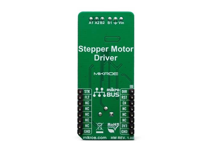 STSPIN820 Click is a stepper motor driver with the PWM current control, selectable microstepping up to 256 microsteps, and a wide voltage range. It is based on the STSPIN820, a stepper motor driver from STSPIN8 series.
