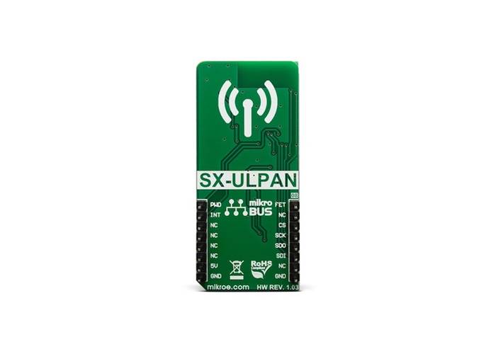 Although the Click board™ uses 5V for the power supply, the SX-ULPAN-SB-2401 module is operated at 3.3V. Having in mind its absolute maximum ratings, it is not advisable to use the Click board™ with MCUs that use logic voltage levels up to 5V.