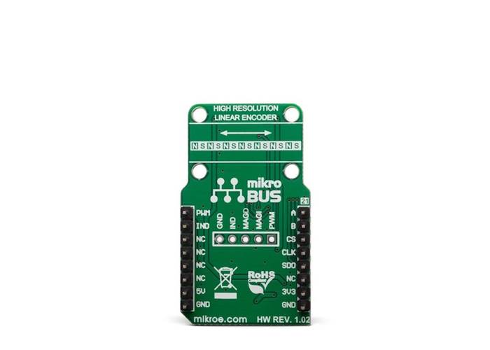 For proper operation of the Click board™, a multi-pole magnetic strip should be properly placed above the IC so that it can move along x-axis only. To support correct placing, the Click board™ comes with four holes, which can be used to accurately position the strip in place. Please refer to the datasheet for more details about the magnetic strip positioning.
