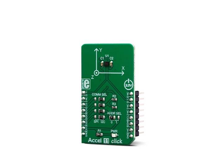Accel 11 Click features an ultra-low power triaxial accelerometer sensor with embedded intelligence, labelled as the BMA456. This Click board™ allows linear motion and gravitational force measurements in ranges of ±2 g, ±4 g, ±8, and ±16 g in three perpendicular axes.