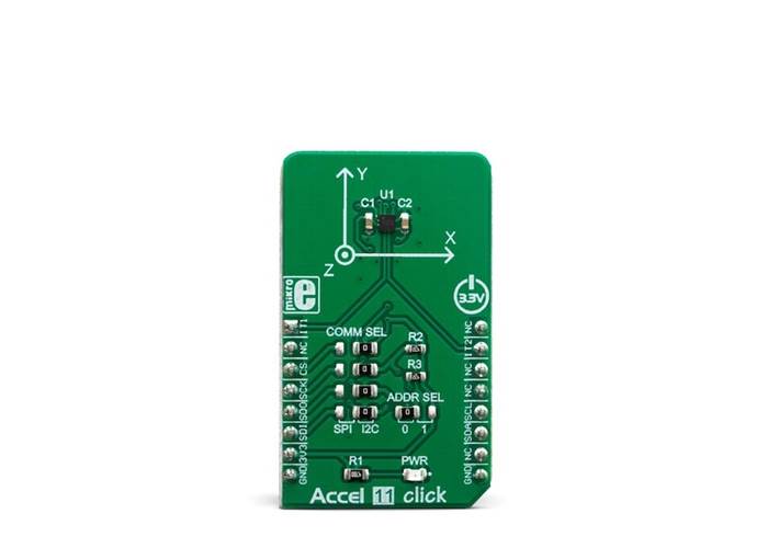 Accel 11 Click offers two communication interfaces. It can be used with either I2C or SPI. The onboard SMD jumpers labelled as COMM SEL allow switching between the two interfaces. Note that all the jumpers have to be positioned either I2C or to SPI position. When I2C interface is selected, an additional SMD jumper labelled as ADDR SEL becomes available, determining the least significant bit of the BMA456 I2C address. The Click board™ should be interfaced only with MCUs that use logic levels of 3.3V.
