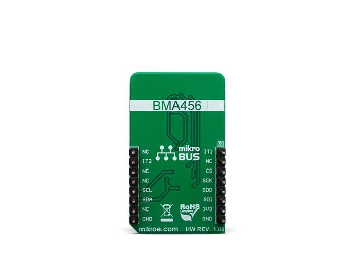 With the total height of 1.10mm, the BMA456 is well suited for using it in wearable and handheld devices. Its powerful event detection engine is equipped with a set of features suitable for a wearable device, including step detection and count, walking activity recognition, tilt on wrist, tap/double tap detection, and any motion pattern detection. The sensor can use any of its two interrupt pins to report a detected event. Accel 11 Click can be used for a rapid development and testing of various applications based on step counting, fitness applications, profile switching and display ON/OFF applications, angle measurement applications, and similar applications.