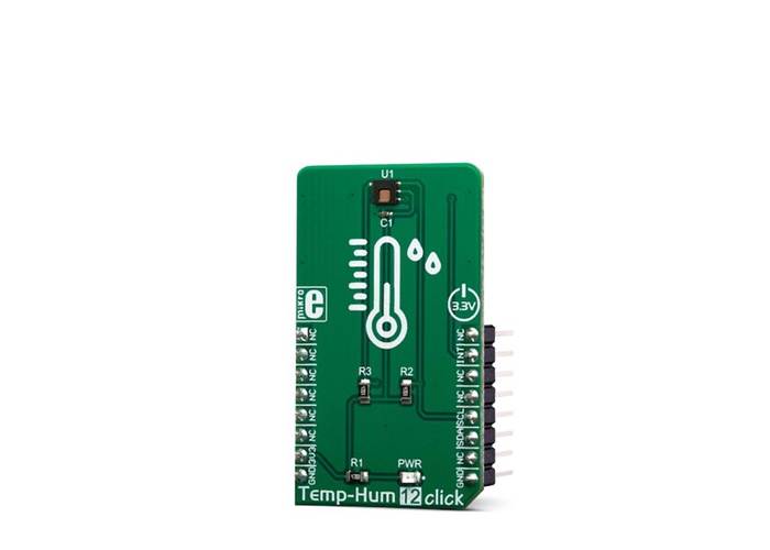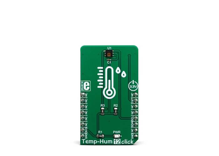 Temp&Hum 12 Click is a smart environmental temperature and humidity sensor Click board™, packed with features which allow easy and simple integration into any design that requires accurate and reliable humidity and temperature measurements. The capacitive-based sensor includes new integrated digital features and a heating element to dissipate condensation and moisture. This translates to a prolonged life of the Click board™ itself.