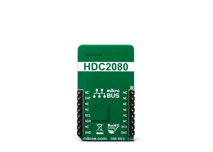 HDC2080 IC uses the I2C protocol to communicate with the host MCU. Its I2C bus pins are routed to the mikroBUS™ I2C pins and are pulled to a HIGH logic level by the onboard resistors. The final I2C address of this IC is already determined by setting ADDR pin to GND (LOW logic level for 0).