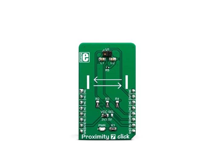 Proximity 7 Click uses an I2C interface to communicate with the host MCU. It is equipped with a SMD jumper labelled as VCC SEL. This jumper is used to select the power supply for the pull-up resistors on the I2C bus, allowing both 3.3V and 5V MCUs to be interfaced with this Click board™.