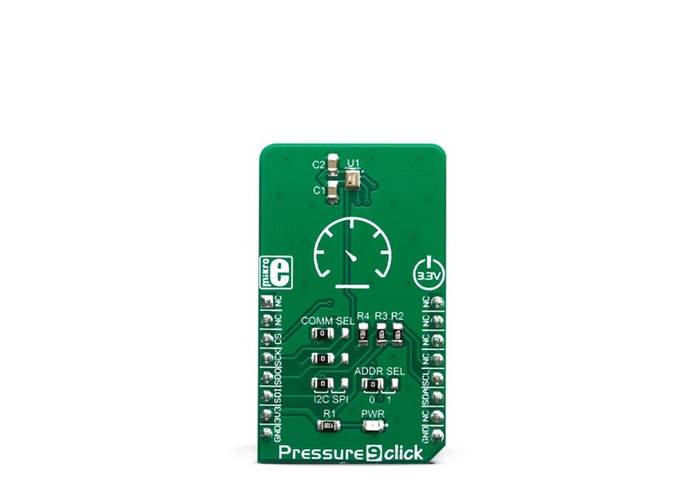 Pressure 9 Click supports both SPI and I2C communication interfaces, allowing it to be used with a wide range of different MCUs. The communication interface can be chosen by moving SMD jumpers grouped under the COM SEL to an appropriate position (SPI or I2C). The peripheral I2C address can also be configured by a SMD jumper, when operated in the I2C mode: a SMD jumper labelled as ADD SEL is used to set the least significant bit (LSB) of the I2C address. When set to 0, the 7-bit I2C peripheral address becomes 0b1110110x. If set to 1, the address becomes 0b1110111x. The last digit (x) is the R/W bit. Please note that each jumper should be moved to the same position, else the communication with the host MCU may not be possible.