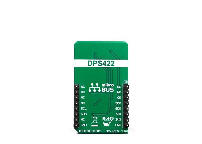 Pressure 9 Click is a digital barometric air pressure sensor Click board™. It is equipped with the DPS422, barometric air pressure sensor, based on a capacitive sensor element. Besides the pressure, this sensor can also measure temperature.