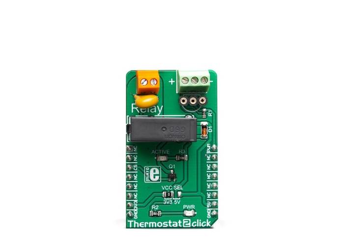 The Click board™ is equipped with all the necessary elements, required to provide a reliable operation: it has a varistor across the relay output contacts, preventing excessive voltage transients, it has a flyback diode for the backEMF generated within the relay coil, and a durable mechanical relay, that can withstand up to 20,000,000 mechanical cycles (no load connected). These features allow Thermostat 2 Click to be used for a wide range of applications that have to be thermally controlled: various home appliances, air conditioners, cooling fans, small heaters, etc.