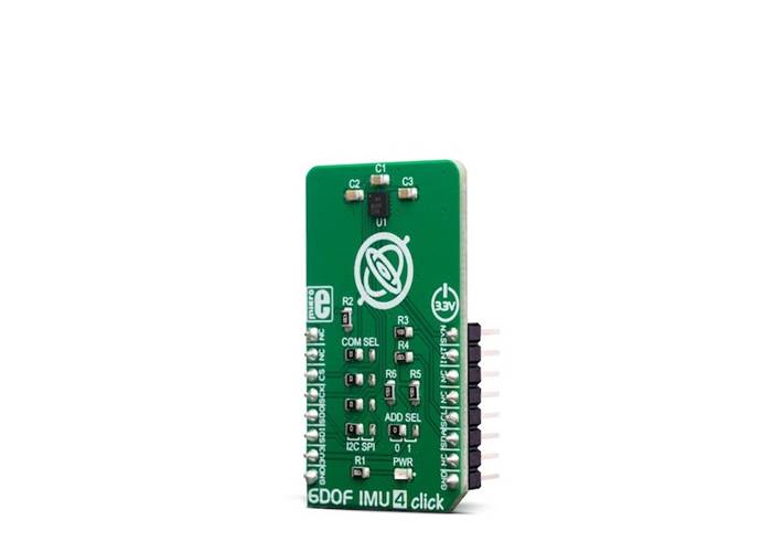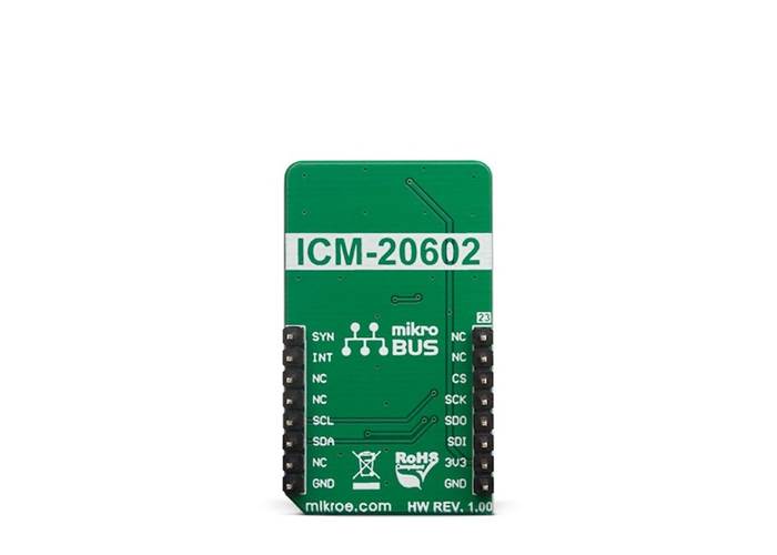 6DOF IMU 4 Click is an advanced 6-axis motion tracking Click board™, which utilizes the ICM-20602, a high-performance integrated motion sensor, equipped with a 3-axis gyroscope, and a 3-axis accelerometer. There is a MEMS on each axis, sampled by a 16-bit A/D converter (ADC). Data streams from each axis are fed to a signal processing engine, offering calibrated readings of each axis over the I2C or SPI interface. A FIFO buffer with 1kb of memory allows MCU firmware optimisation. Packed with a set of powerful options, this Click board™ represents an ideal solution for development of MotionTracking™ applications.