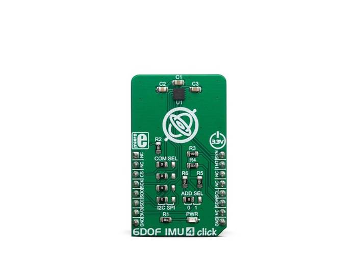 6DOF IMU 4 Click supports both SPI and I2C communication interfaces, allowing it to be used with a wide range of different MCUs. The communication interface can be chosen by moving SMD jumpers grouped under the COM SEL to an appropriate position (SPI or I2C). The peripheral I2C address can also be configured by a SMD jumper, when the Click board™ is operated in the I2C mode: a SMD jumper labelled as ADD SEL is used to set the least significant bit (LSB) of the I2C address. When set to 1, the 7-bit I2C peripheral address becomes 0b1101000x. If set to 0, the address becomes 0b1101001x. The last digit (x) is the R/W bit.