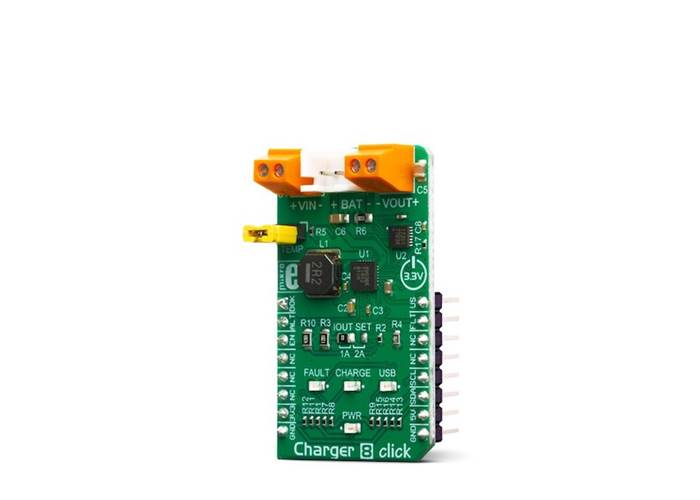 Charger 8 Click is an intelligent Li-Ion battery charger, system power manager, and a battery fuel gauge Click board™. As a system power distributor, it can supply up to 2A to a connected load. By utilising an externally connected power supply, it can charge a single-cell Li-Po/Li-Ion battery. A dedicated power management IC with the optimised smart power control allows very efficient management of the available power. An additional battery fuel gauge IC with proprietary battery aging prediction algorithm and time-to-empty / time-to-full estimation, offers the complete diagnostic related to the battery charging process.